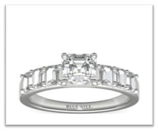 The ring can be set with an Asscher cut diamond, which works well to give the ring a bold edge. Four white gold prongs will hold the center diamond in place, which gives the diamond space to absorb and reflect light and helps to accentuate the shine of the center diamond.