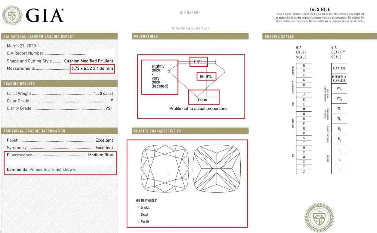 In addition to the well-known 4Cs, it is imperative for buyers to be familiar with the following key aspects of a cushion cut diamond grading report or certificate, as highlighted in the image below.